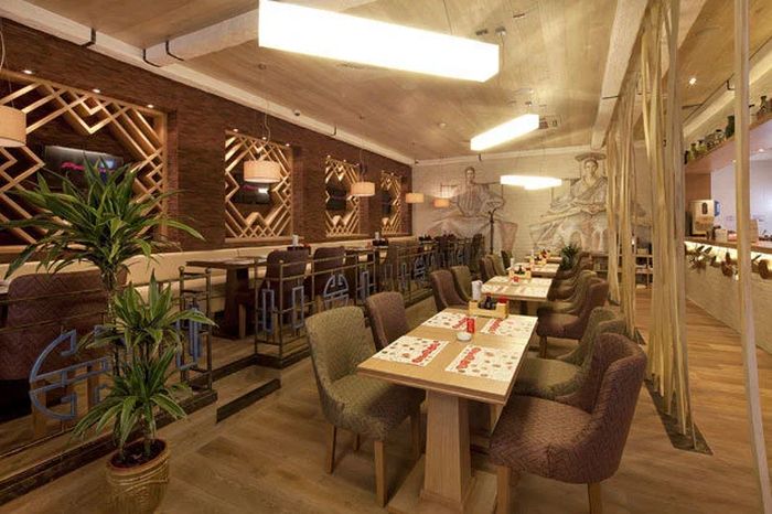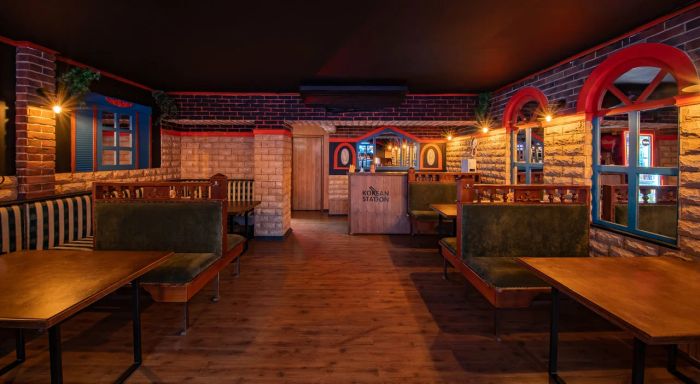 Дизайн ресторана «Korean Station» выполнен в сдержанном восточном стиле с преобладанием камня, дерева, с множеством вариантов освещения.