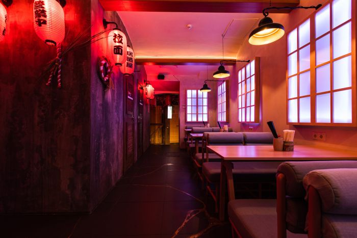 В оформлении присутствует много дерева, традиционных осветительных приборов в форме фонариков, мягкие удобные кресла и скамейки, большие столы, реечные или бамбуковые перегородки для удобства посетителей. Сервис безупречный. Уже на входе встречает самурай, ударом в гонг сообщает коллегам о приходе новых гостей. Провожает на свободные места. Официанты с японской вежливостью предлагают обширное меню, более 200 позиций.